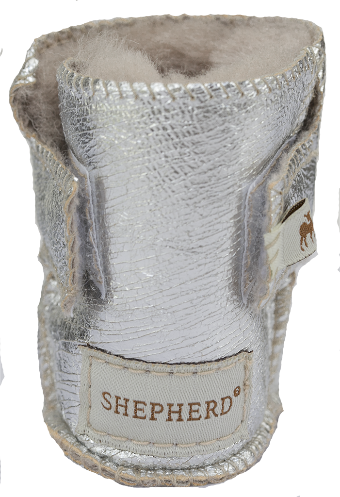 Shepherd för våra minsta familjemedlemmar. Åh, så söta silver fårskinnstofflor! Mjuka och sköna att ha på små goa fötter.