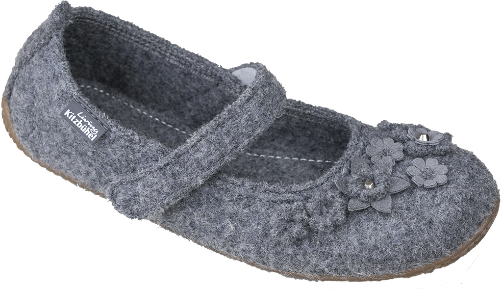 Sötaste ballerinas i ren ull för både små och större damer. Tunn flexibel gummisula och ställbart kardborre band på foten. Blommor i mocka och ull på foten förvandlar dessa gråa ulltofflor till eleganta inneskor.