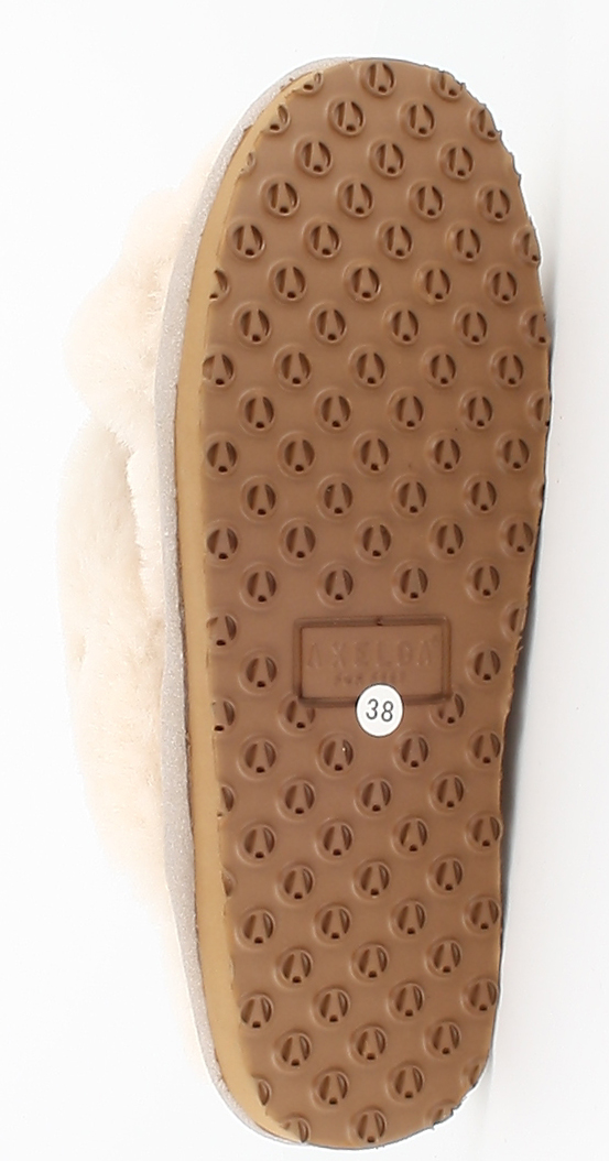 Sköna fårskinnstofflor i varm beige. Öppen modell som används året runt. Korslagda band i mjukt fårskinn, polstrad innersula för ökad komfort. Eva sula så at du även kan springa ut med dessa sötisar.