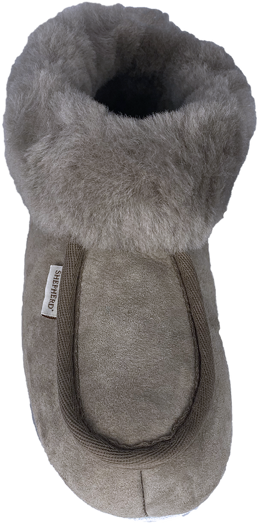 Fårskinnstofflor i lite högre modell.Sköna tofflor för inomhus, för dam som håller ankeln varm. Tofflorna går lite högre upp. Fårskinnskrage går att vika upp. Mockasula.