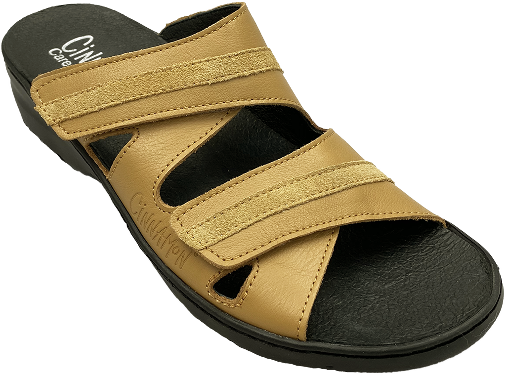 Sköna och lätta damsandaler i skinn med mockadetaljer. Mjukt skinn med 2 ställbara kardborre band. Kilklack på 4,5 cm för bra komfort åt ryggen. Innersula är urtagbar om du vill använda dina måttanpassade innersulor.
