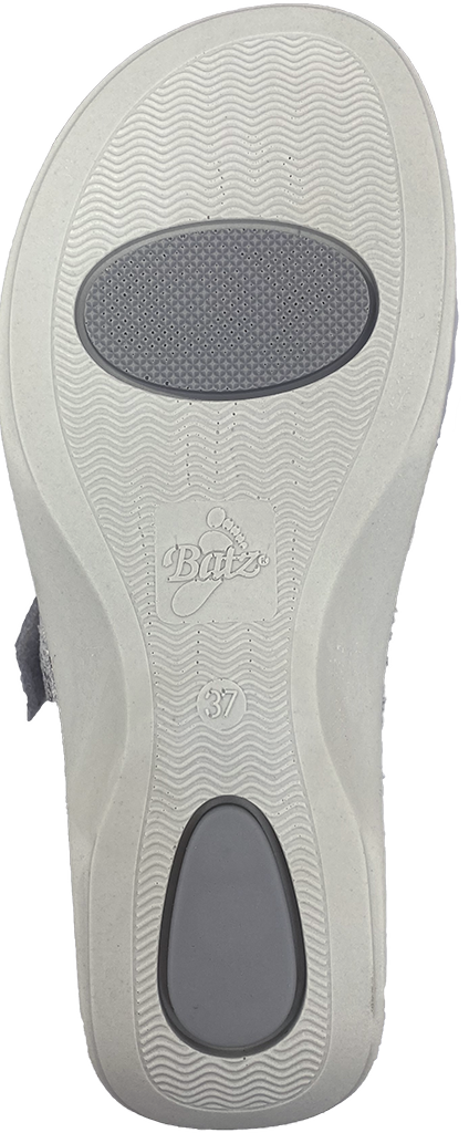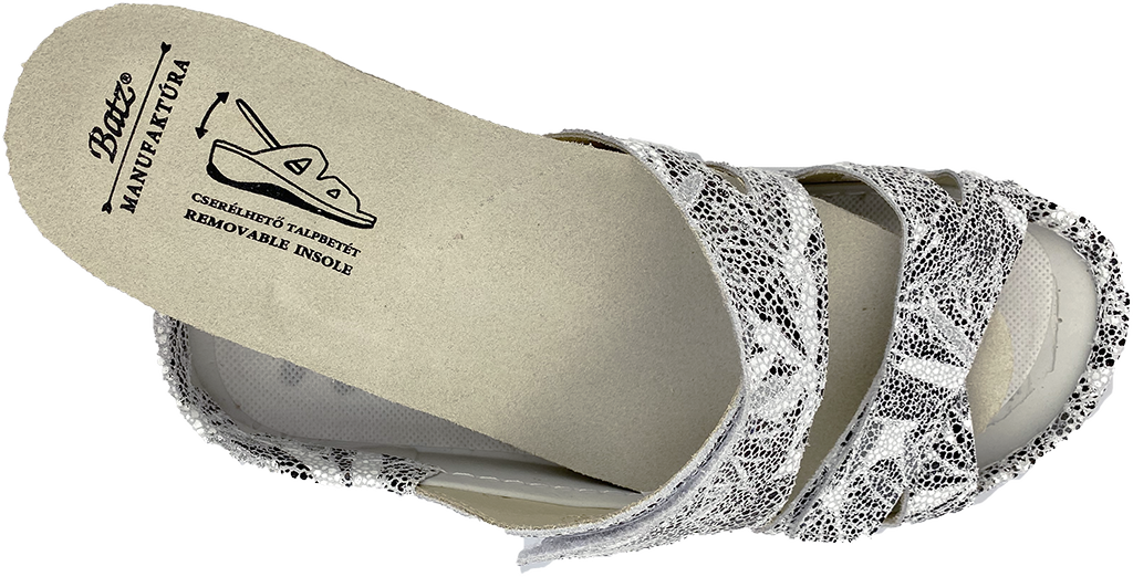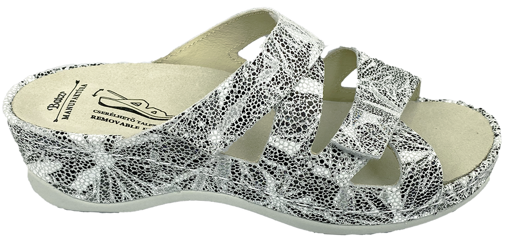Batz Evelin tofflor i grå mix har urtagbar innersula. Fina sandaler med en anatomisk innersula i en ny svart-grå mönstrad mocka.