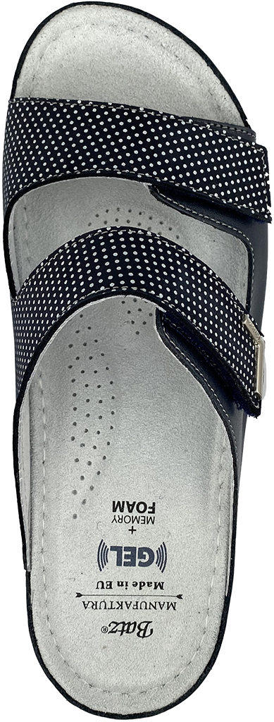 Denna slip-in modellen i skinn har 2 ställbara band på foten. Små prickar ger sandalerna en lekfullhet och dessa sandalerna är lätta att kombinera med olika färger i garderoben.