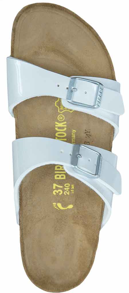 Birkenstock Sydney är en elegantare modell i Birkenstock sortimentet. Ovansidan är i det tåliga och välkända Birkoflor materialet i perlvit lack. Kombinationen med spännen i matt metall gör dessa sandaler eleganta och de är samtidigt väldigt sköna.