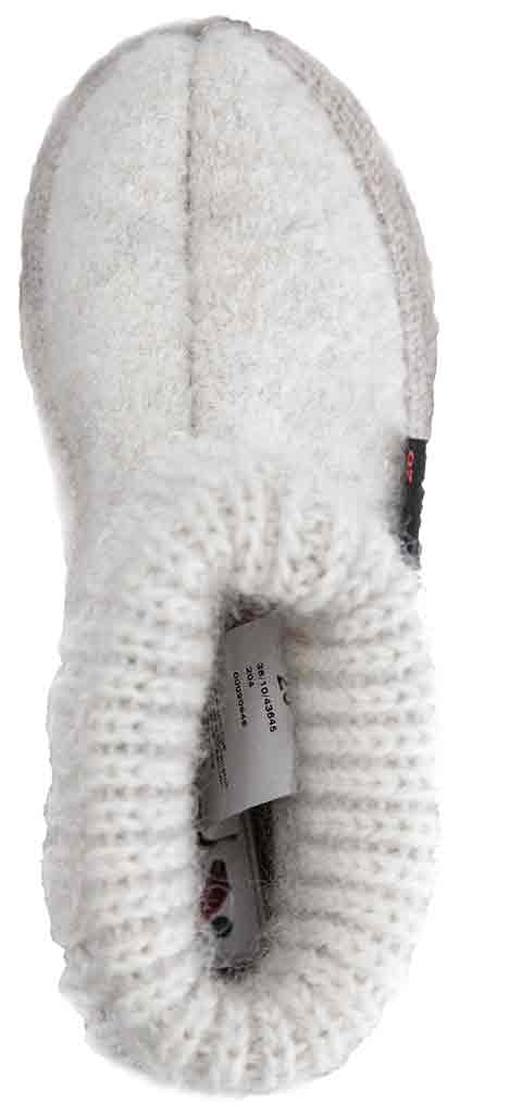Sköna, lätta tofflor i strumpmodell i finanste ull med yttersula i naturgummi. Tofflorna är vikbara. Varm beige ton med stickade detaljer.