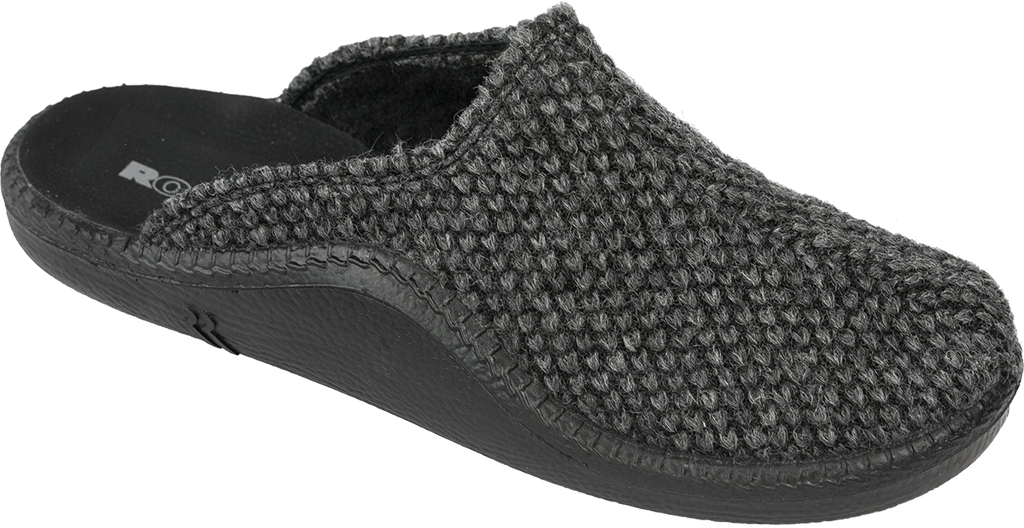 Stabila herrtofflor med stöd från den yttersula som går högt upp på sidorna. Innersulan är inte uppbyggd. Lite tuffare look i ull. Yttersula har antihalkränder. Du kan även gå ut. Innersula är i bomullsfrotté.