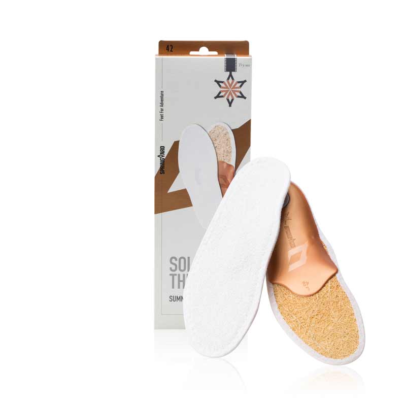 Fotbädd: Anatomiskt formad helsula med ovansida i bomullsfrotté och sisal hampa. Sulan stöder både förfoten och hålfoten och samtidigt behåller foten sin naturliga gångrörelse. Hälkudde som absorberar stötar. Bomullsfrotté har en hög fuktabsorberingsförmåga. Sisalhampa ger dämpning och håller fötterna fräscha. Lufta sulorna efter användning.